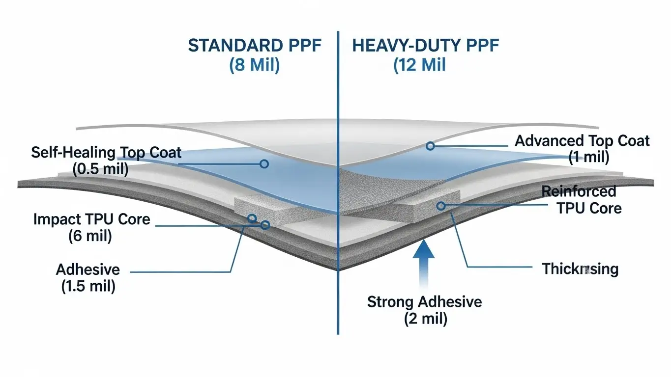 Stand 2026, die dickste kommerziell erhältliche Farbschutzfolie (PPF) Für Verbraucherfahrzeuge liegen Fahrzeuge typischerweise zwischen 10 An 14 Mils, Je nach Marke und spezifischem Charakter "Offroad" oder "hochleistungsfähig" Paket ausgewählt. Während der Industriestandard konstant bleibt bei 7.5 An 8 Mils, Spezialisierte Aufprallfilme für Rennwagen entwickelt, Geländefahrzeuge, und stark genutzte Bereiche ... Weiterlesen